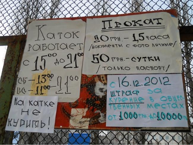 Ученики школы катаются бесплатно. Для гостей прокат коньков – полтора часа – 20 грн. Вход на лёд с личными коньками – 5 грн.