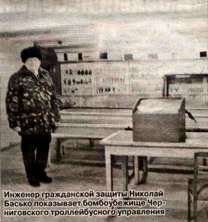 В Чернигове около 100 защитных сооружений, и только одно — под Кукольным театром- рассчитано на защиту от радиационного излучения. Эти сооружения есть на всех крупных предприятиях города, таких, как КСК, «Химволокно»,«Пивзавод» и др. Они относятся ко второй категории и прямого попадания сверхмощного оружия не выдержат, но от артобстрелов и от химических атак защитят. И в таких бомбоубежищах сможет пересидеть только работающая смена. Что касается людей, которые на момент атаки будут находиться дома, то работники соответствующих ЖЭКов и ЖРЭУ должны заранее сообщать жителям, где находятся такие сооружения и как туда попасть. Могу сказать, что почти все бомбоубежища в нормальном состоянии.