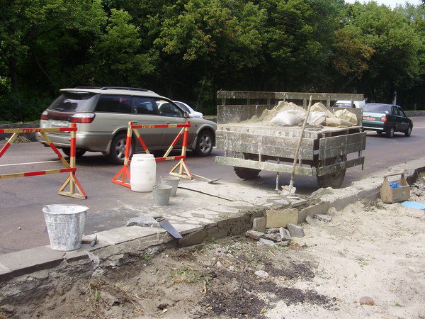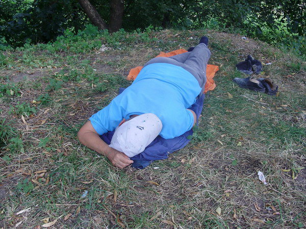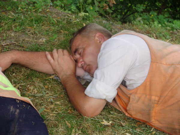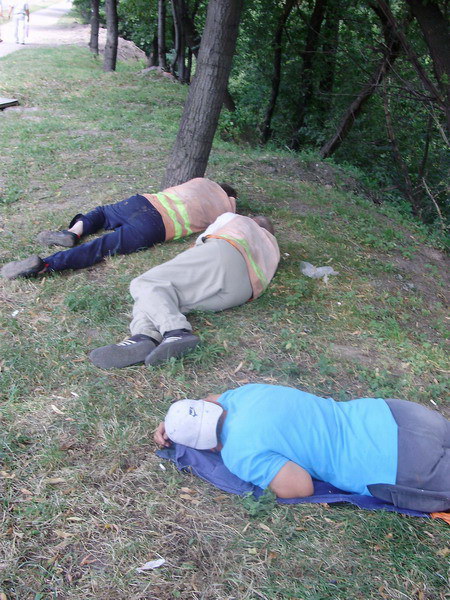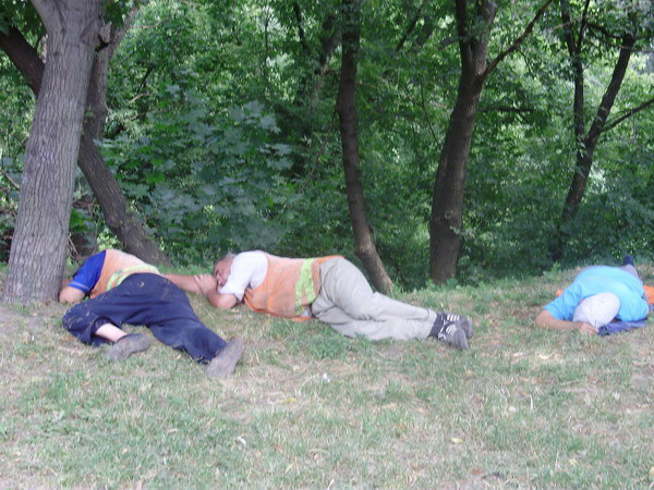 Под таким девизом проходит ремонт участка проезжей части пр-та Мира, что недалеко от черниговского коллегиума. Строителям в такую жару совсем не до работы. Побросав лопаты и молотки они укрылись в тени деревьев, чтоб сладко поспать. В принципе занимались они этим в обеденное время (в 13.20), но кто знает, может спят они так с самого утра? Да и когда проснуться неизвестно. По крайней мере наш корреспондент не заметил возле них бутылок спиртного или чего то подобного. Зато все прохожие оборачивались в недоумении. А люди из окон маршруток и троллейбусов так же с улыбкой комментировали эту сиесту по-черниговски.