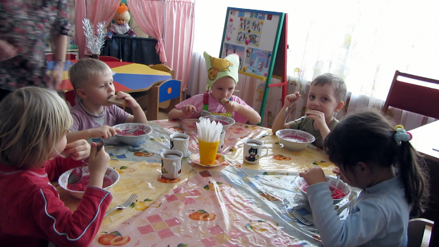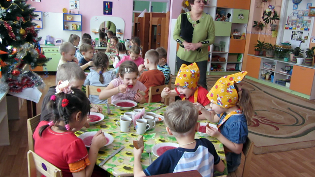 Все дети едят с удовольствием. По словам родителей, с которыми нам удалось пообщаться, детям еды хватает: голодными из-за стола не встает ни кто. Специально для родителей в каждой группе вывешивается меню с указанием норм блюд на завтрак, обед и ужин.