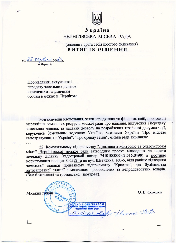 Як відомо Чернігівська міська рада виділила комунальному підприємству,яке очолює депутат міськради Артем Стах 5 соток для будівництва автозаправочної станції. В самому рішенні сказано, що земля виділяється біля ділянки попередньо виділеної для ПП «Кристал».