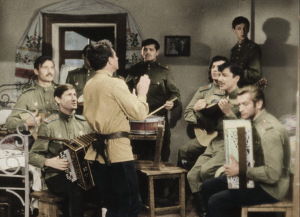 Подивилися фільм разом. Міністр невдоволений, мовляв, що це за стрічка, де люди гинуть на полі бою, а живі пісеньки співають. Такого, каже, на фронті не було і бути не могло. Я запитав, чи був він сам на фронті. У відповідь почув: «Ні, але знаю». І тоді я розповів міністру, що воював на одному з літаків, подарованих полку Леонідом Утьосовим, що Леонід Осипович зі своїм джаз-оркестров приїжджав до нас, що ми разом співали, вдалося його переконати. Хоча, думаю, що на міністра подіяли не стільки мої слова, скільки генеральські еполети та дві зірки Героя.