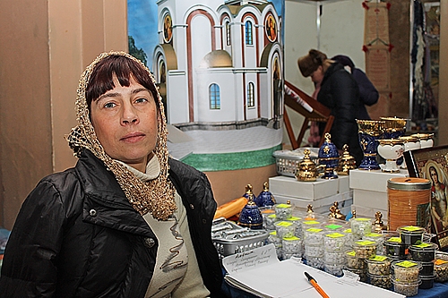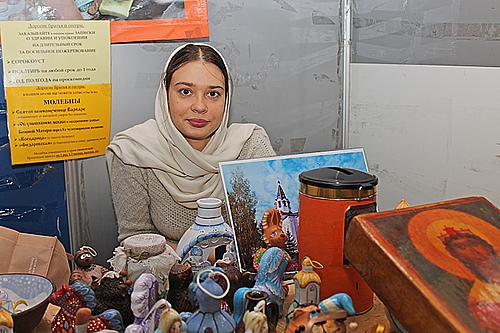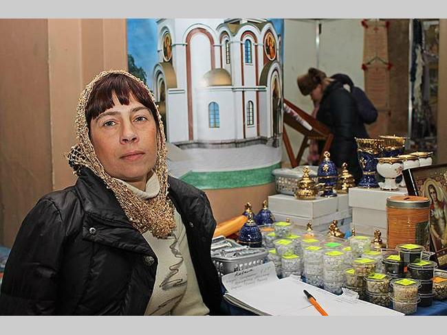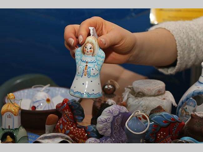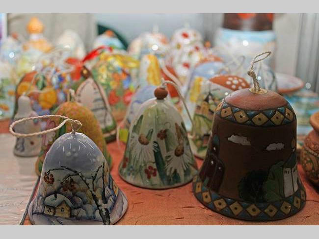 Марьяна, сотрудник храма: — Приехала из России, город Смоленск. Нашему древнему городу в этом году исполняется 1150 лет. Представляю Приход храма Святой великомученицы Варвары. У нас при храме есть керамическая мастерская, и мы привезли на выставку свою продукцию. Здесь, как видите, в основном керамические колокольчики. Батюшка благословил их, чтобы они приносили радость в каждый дом.