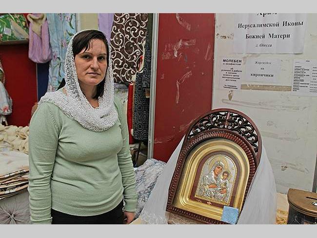 Лариса, свечница: — Приехала из Одессы. Работаю при Храме Иерусалимской Иконы Божией Матери. Храм маленький, службы в нем идут, и мы собираем пожертвования на именные кирпичики из которых будет возводиться новый храм. Иерусалимская Икона Божией Матери — покровительница семьи. Также к ней обращаются пары, которые хотят иметь детей.