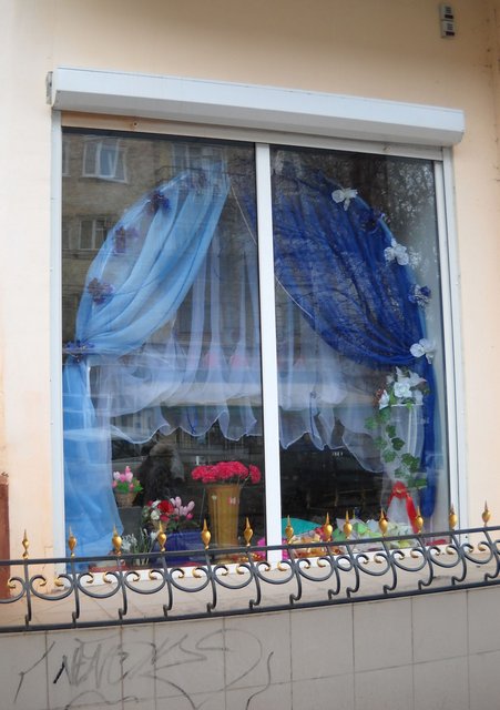 А наиболее креативными в нашем городе являются витрины свадебных салонов. Любопытно, почему так? Наверное, конкуренция в этой сфере такая серьезная, что их хозяева готовы буквально бороться за каждого клиента. В витринах свадебных платьев и аксессуаров увидим манекены в роскошных нарядах, арки из цветов для выездных церемоний. Но чаще всего люди обращают внимание на «девушку» в фате и белом платье, которая в любую погоду, даже в морозы, сидит на перилах магазина свадебной моды недалеко от Дворца бракосочетаний. Это, конечно, манекен, но очень похожий на живого человека.