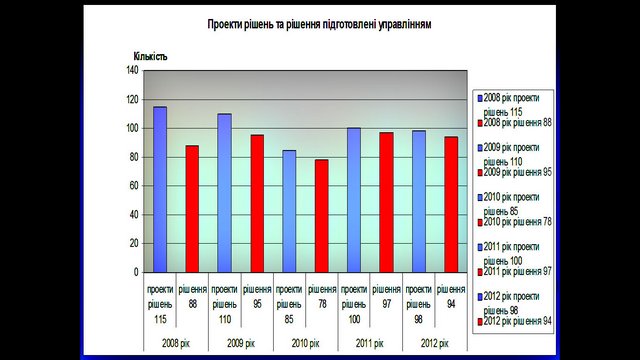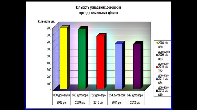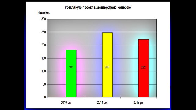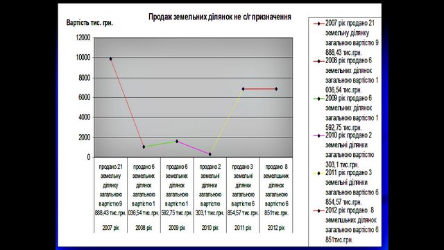 В 2012 году по сравнению с 2011 годом возросло количество участков несельскохозяйственного назначения, которые были проданы Черниговским городским советом. Если в 2011 году продали 3 участка, а в 2012 – восемь. Правда, Юрий Титаренко не уточнил, какая общая площадь участков была продана в 2011 году. Но то, что тогда стоимость 3-х участков была выше, чем стоимость 8-ми участков в 2012 году – было указано в продемонстрированном слайде презентации.