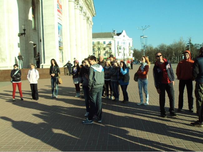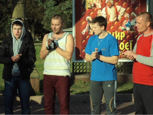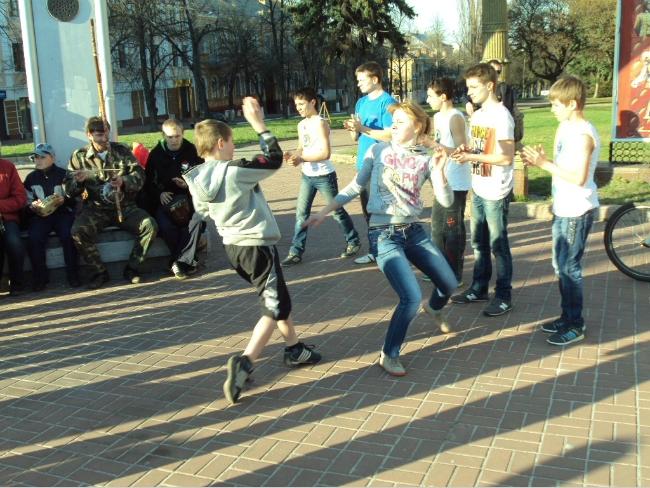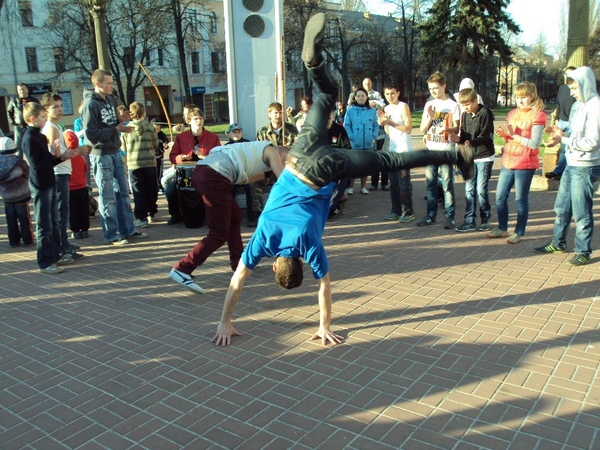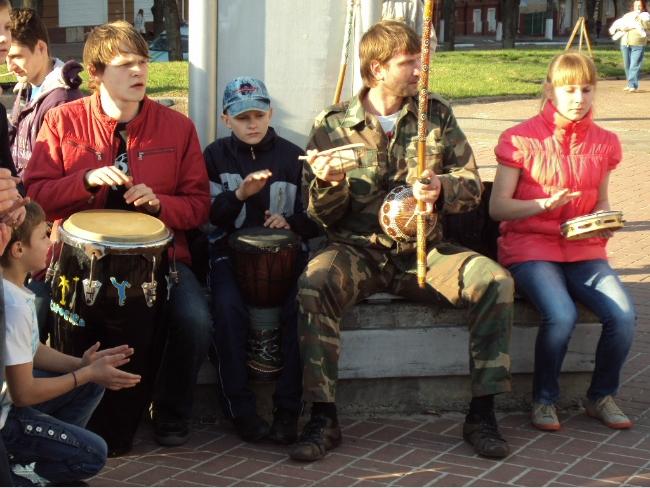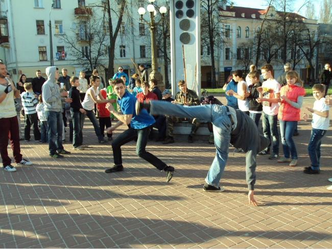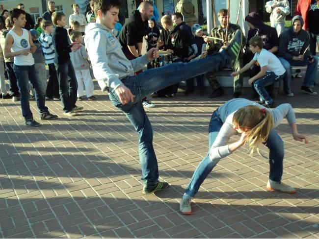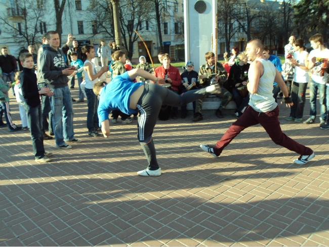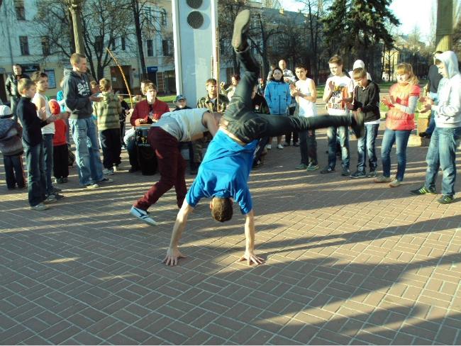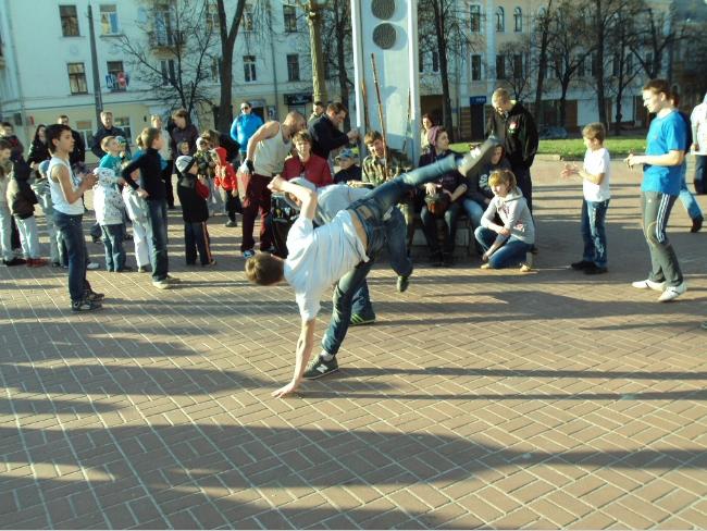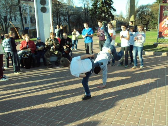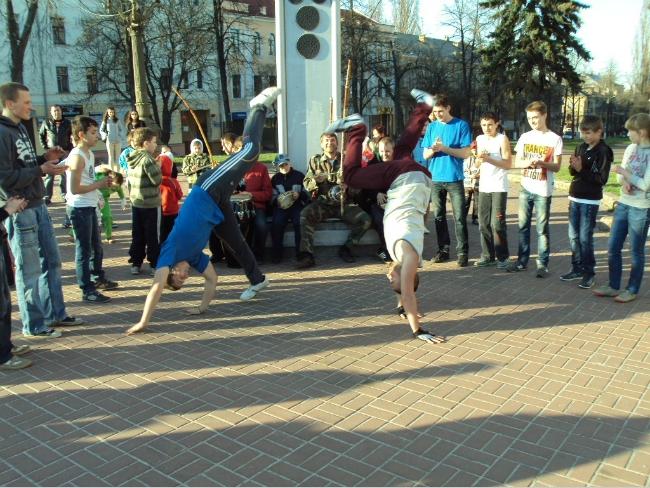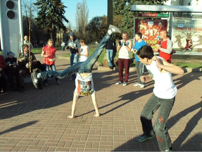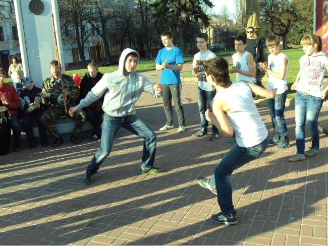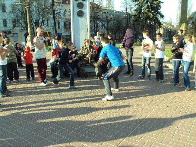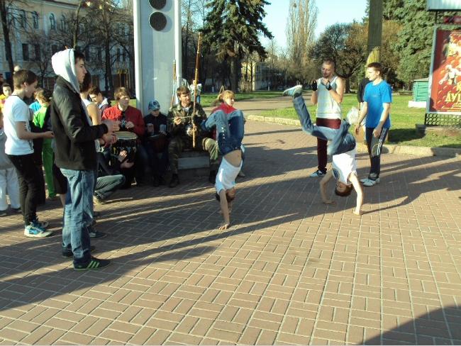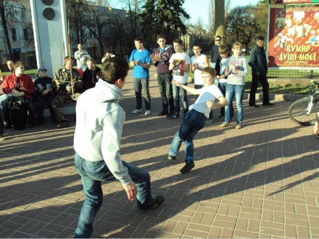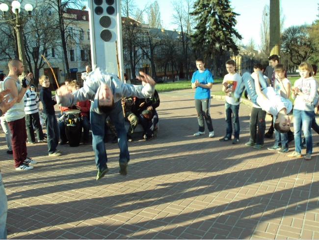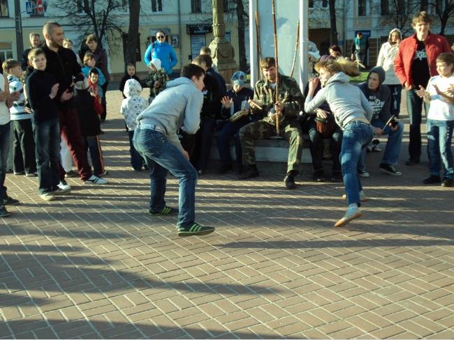 21 апреля, в воскресенье, примерно в 18 часов возле Черниговского областного музыкально-драматического театра имени Т.Г.Шевченко собралась группа людей, чтобы посмотреть на то, как молодые парни и девушки упражняются в бразильском боевом искусстве с элементами танца под названием капоэйра.