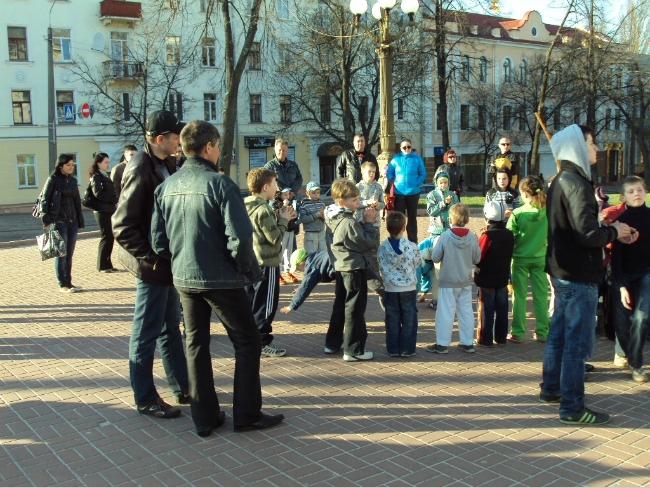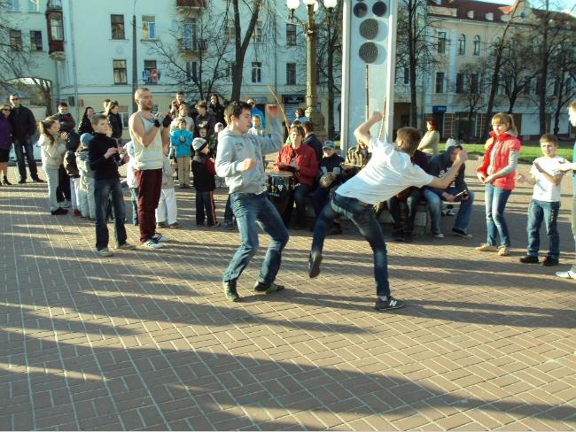 На площади собрались участники школы капоэйры «Белый ветер» с целью записать специальное видео. После чего мы решили устроить показательное выступление прямо на улице. Уже весна, тепло, поэтому мы будем все чаще выходить из спортивного зала, дабы проводить занятия на свежем воздухе.