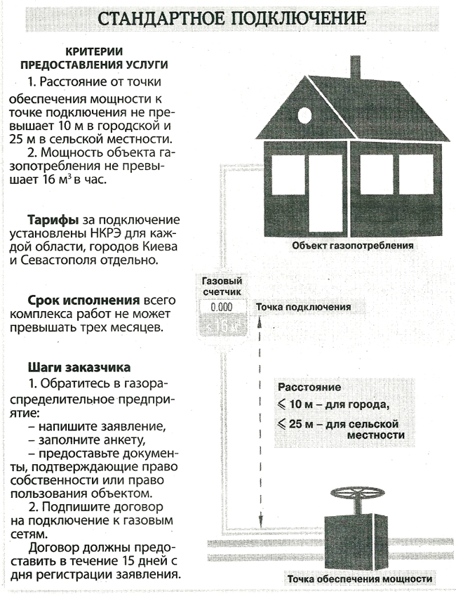 Условия газификации отличаются в зависимости от статуса заказчика. Для стандартного присоединения заказчика -физического лица расстояние от точки обеспечения мощности до точки присоединения не должно превышать 10 метров в городской и 25 метров в сельской местности. Стоимость услуги по стандартному присоединению будет меняться в зависимости от типоразмера счетчиков, типа местности и газопровода.