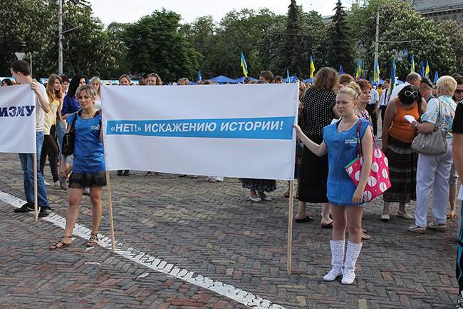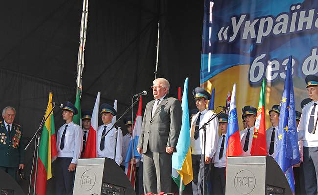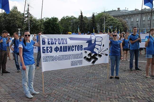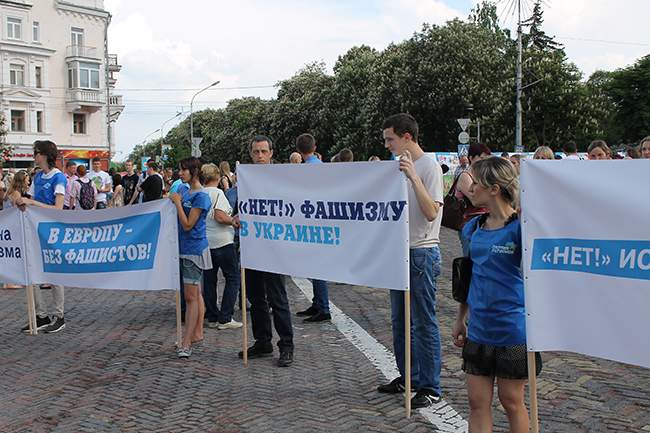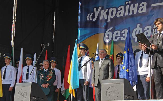 Депутат областного совета от Партии регионов Валерий Зуб обратился к участникам акции с вопросом: «Почему так случилось, что в стране, которая ценой невиданных человеческих жертв победила фашизм, сегодня возрождается человеконенавистническая нацистская идеология? А ее носителями не в последнюю очередь есть политики, чьи деды и родители проливали кровь на фронтах, отстаивая свободу и независимость нашей Родины».