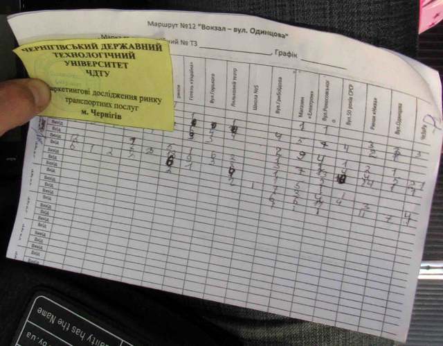 На каждой остановке эти люди делали в табличках какие-то отметки. Это начался процесс сбора информации о транспортной сети Чернигова. А ребята отмечали количество пассажиров, которые вошли и вышли из автобуса (троллейбуса).