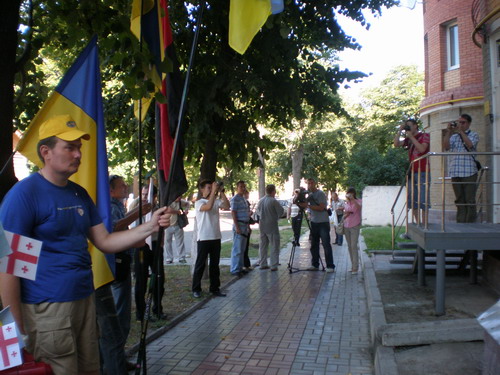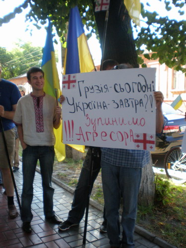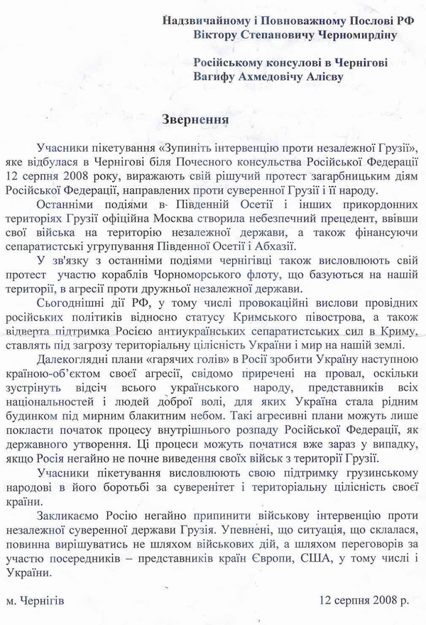 Сьогодні, 12 серпня, о 10 годині під почесним консульством Російської Федерації по вулиці Кирпоноса, 7 зібралося 30-40 людей з прапорами України та прапорцями Грузії, які висловлювали свій протест проти дій Росії в Грузії. Організаторами виступили молоді люди Чернігова без прив'язок до партій та політичних сил.