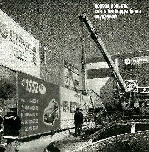 Первый раз за бигбордами (большими щитами, размещение рекламы на которых стоит до двух тысяч гривен в месяц), возле «Макдональдса», на перекрестие Комсомольской Й проспекта Победы в Чернигове, приехали в середине апреля, днем. Коммунальщики (представители коммунального предприятия «Участок по контролю и благоустройству города» горсовета) собирались снять шесть больших рекламных щитов - бигбордов, установленных на участке 74-летней Тамары Лукашук.