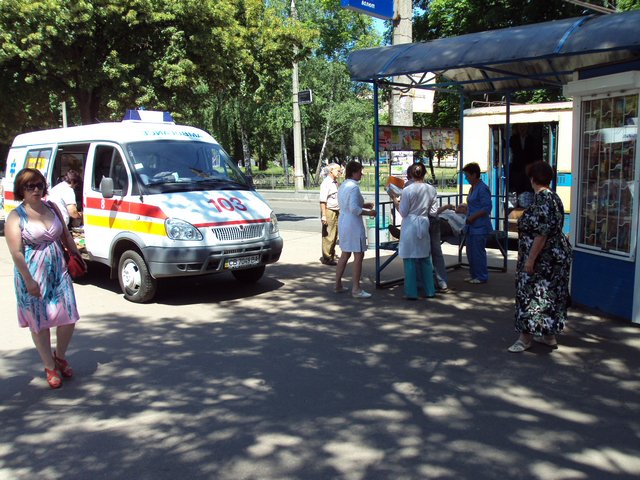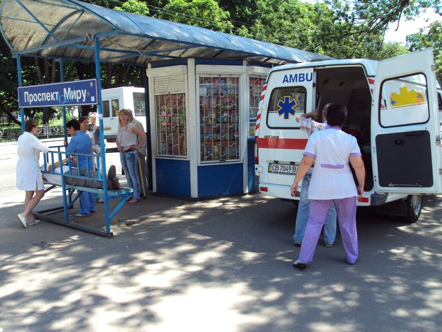 Сильная летняя жара начинает сказываться на здоровье черниговцев. Сегодня, примерно в 14 часов дня на остановке по ул. Проспект мира, 36А лежал мужчина лет шестидесяти, а вокруг него столпилось несколько докторов бригады скорой помощи, которую, судя по всему, вызвал кто-то из прохожих. Чтобы узнать, что случилось, я обратился за комментарием к доктору, но единственное, что мне сказали это то, что пожилому мужчине стало плохо из-за очень жаркой погоды. Примерно минут через 10 его погрузили в карету скорой помощи и увезли.