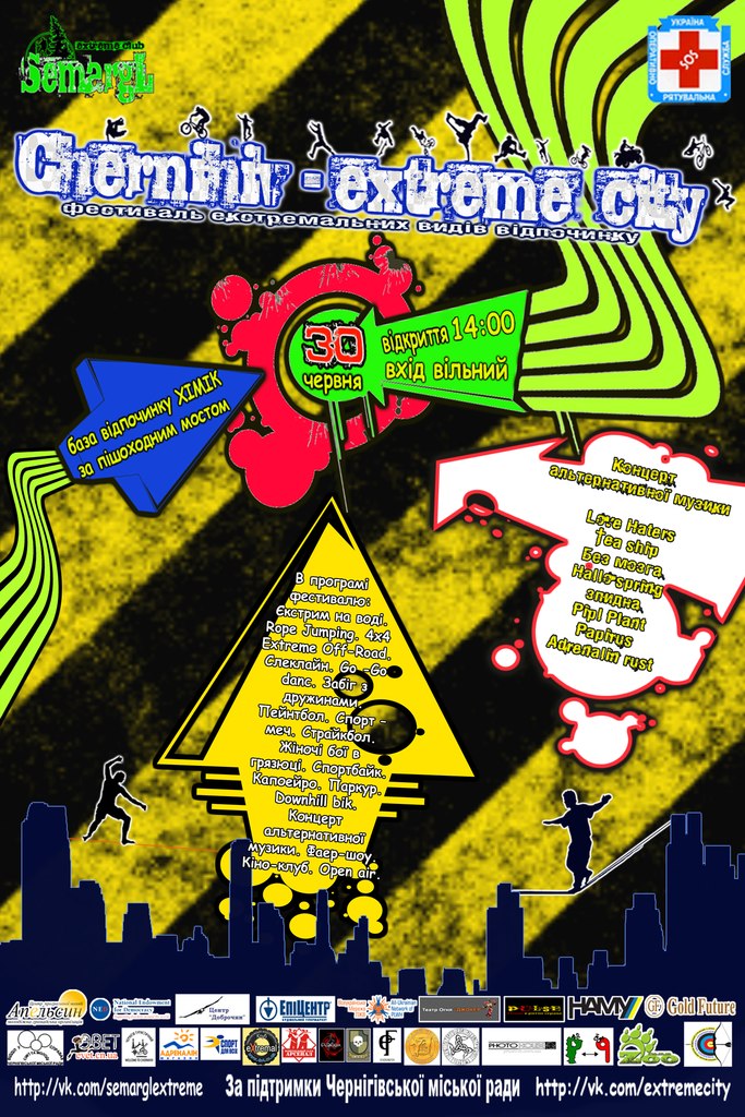 Чернігівська міська молодіжна організація "Клуб екстремального відпочинку "Семаргл" не дає занудьгувати шанувальникам активного відпочинку. Цього року вони вдруге проводять фестиваль екстремальних видів спорту Chernihiv - x3m city для тих, хто перед всіма іншими видам відпочинку віддає перевагу драйву, швидкості, емоціям та здоровому способу життя.