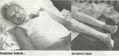 Владимир Тюфтий лежит в травматологии Черниговской горбольницы №2. На лице под правым глазом синяк. Обе ноги в гипсе, перебинтованы от щиколоток и выше колена. Лежит на спине, нельзя даже на бок поворачиваться.