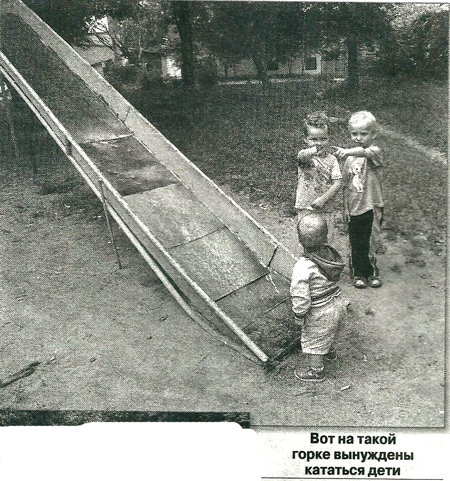 «Добрый день, уважаемая редакция газеты «ГАРТ»! Мы, жители домов 9 и 11 по улице Гагарина, обращаемся к вам с просьбой разобраться в нашей ситуации и посодействовать ее реше-. нию. У нас общий двор и много семей с маленькими детьми, но, к сожалению, обустроенной детской площадки у нас нет. А есть лишь ржавая горка, которая стоит, вероятно, еще с советских времен, и старые футбольные ворота. Мы со своей проблемой обращались в КП «ЖЭК-13», непосредственно к начальнику Владимиру Прищепу и к мэру Чернигова Александру Соколову. Но результатов это пока не дало.
