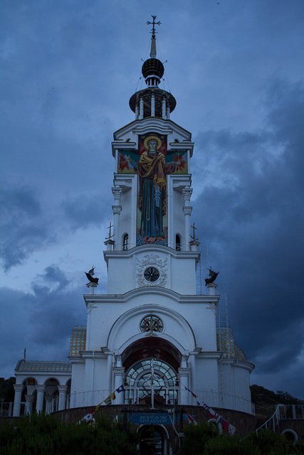 Із оглядового майданчика храму відкривається прекрасний краєвид на бухту. Екскурсоводами в музеї щоліта їздить працювати купа моїх знайомих із Чернігова, а директор його - давній мій товариш Сергій Тонканов. З таким блатом ми з Дашею отримали по музею безкоштовну екскурсію. Ціна її для дорослих 45 і 25 грн. (з екскурсоводом і без) а для дітей - 30 і 15 грн. відповідно. Також, як свої, ми користувалися всіма благами цивілізації: водою, зарядкою мобільних телефонів і вечірками із малоріченською "Марсалою" під гітару біля вогнища щовечора.