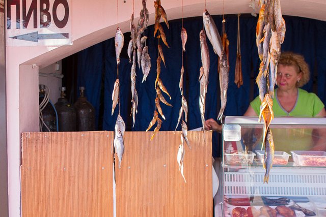 На ринку ціни дуже різні, треба шукати і торгуватися. Так, черешні, за які в одному місці тітка-українка просила двадцять п’ять гривень, ми купили через двадцять метрів у татарина по п’ятнадцять. Приблизно та ж ситуація і з іншими місцевими фруктами. В цілому - ціни очікувано вищі за чернігівські. Кефір яготинський 0,5л в магазині - майже 9 грн. Місцеве кримське "Живе" пиво із кега на пляжі 24 грн. за літр.