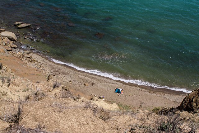 Отже, Тиха бухта. Пляж на початку бухти з боку Коктебелю є піщаним і зручним для заходу у воду. Тут і зосереджується більш частина туристів, для них існують всякі зручності типу туалетів і виїзної торгівлі, прокат кайтів, дайверського спорядження і т.д. Далі вздовж берега характер пляжу змінюється. За невеликою скелею, де починається дикий пляж, на самій лінії прибою пісок переходить в каміння. Берег всіяний галькою, дно таке ж кам’янисте і не дуже зручне для купання. Недолік стає перевагою, коли згадати про те, що мало хто хоче відпочивати тут, поки є вільні більш зручні місця, і на всьому пляжі довжиною кількасот метрів стоїть штук п’ять палаток, і ще може стільки ж нагорі, на невеликій кручі. Ось вам і початок червня! У липні-серпні це місце виглядає зовсім інакше - від автомобілів і наметів немає жодного вільного клаптику берега.
