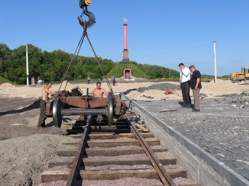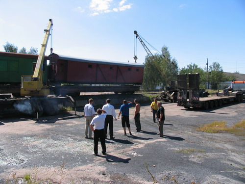 Семь вагонов и платформу, подталкивая с двух сторон тепловозами, транспортировали из Чернигова на запасной путь станции Круты. В этом месте проходит железнодорожная линия Нежин – Москва и очень оживленное движение, поэтому надо было, перегружая вагоны в трейлер, вписаться в 15-минутный промежуток времени, когда закрывали железнодорожный переезд и можно было проскочить. Загружая вагоны кранами, боялись повредить их нависающие крыши, тому же вагоны оказались длиннее трейлера и свисали с него на пару метров. Уже в Крутах сначала ставили на проложенных рельсах колесную пару с торчащим штырем, а потом уже нанизывали на него вагон. Всего в этой операции было задействовано шесть кранов, КРАЗы, автодоровский трейлер — плюс максимальное участие заместителя министра транспорта Украины .Василия Шевченко. В три намеченных для операции дня не уложились бы, если бы все происходящее не корректировал на своем высоком уровне заместитель губернатора Владимир Приходько.