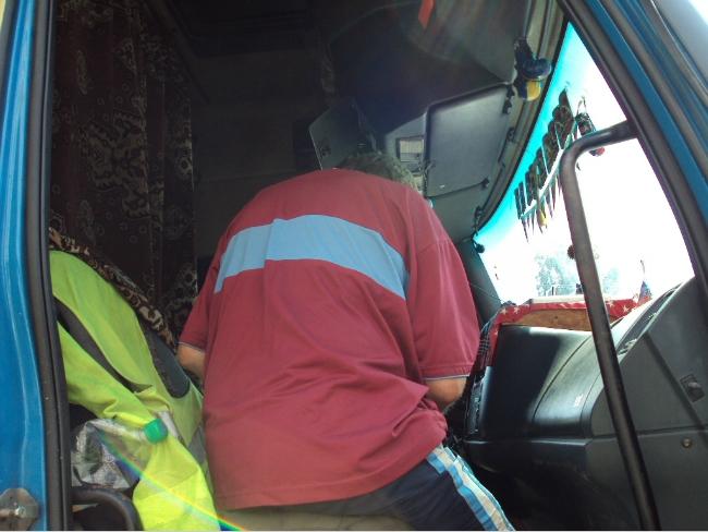 Попытки узнать у водителя фуры причину остановки не дали результата. Сначала водитель утверждал, что знака, запрещающего парковку и остановку нет, потом говорил, что остановился для высадки пассажира. Затем на повышенных тонах водитель стал бросаться фразами на подобии «Ты кто такой?», «Иди отсюда» и т.д. В конечном итоге повернулся ко мне спиной и перестал разговаривать.
