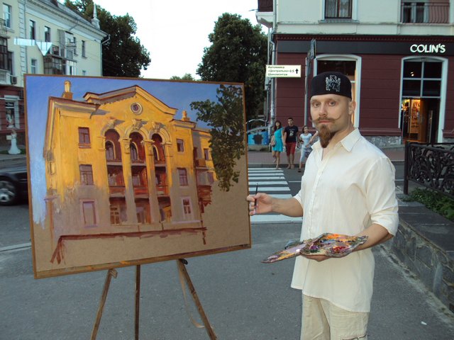 31 июля, примерно в 21.00 в сквере по проспекту Мира, недалеко от Красной площади, многие прохожие могли наблюдать за работой черниговского художника Дениса Бугрова, известного в городе не только своими картинами, но и незаурядной экстравагантной внешностью.