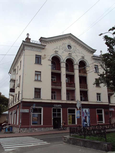 Об истории этого дома я ничего не могу сказать, но это очень хороший архитектурный проект. Сам по себе дом очень красиво скомпонован. В Чернигове мало лепнины, но на площади и по проспекту Мира есть такие дома, которые запросто моли бы стоять рядом с венецианскими домами, если учесть их целостный художественный замысел. Архитекторы постарались. Очень изящные, в данном случае, три арки фасадной части дома. Эти фрагменты являются очень хорошим украшением Чернигова. В детстве в этом доме я покупал хлеб. 15 лет я мечтаю написать этот дом.