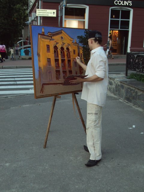 Да. Я живу здесь в 6-ти кварталах отсюда, но все равно нести все не совсем легко. Я надеюсь, что люди с этого дома мне помогут тем, что я у них смогу оставлять этюд. Данная картина весит около 10 кг. В принципе для физической формы подобная разминка будет полезна.