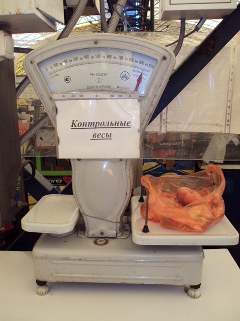 Итак, эту историю я описал потому, что она произошла перед контрольным взвешиванием. Теперь, непосредственно, перейдем к самому контрольному взвешиванию. На контрольных весах можно взвесить продукцию до 1 кг. Гирьки, по словам рыночных торговцев, постоянно воруют, в результате чего администрация рынка их попросту изъяла из свободного доступа. Поэтому хочу выразить благодарность рыночному торговцу Анатолию Евгеньевичу, который помог мне перевесить арбуз и дыню, масса которых превышала 1 кг.
