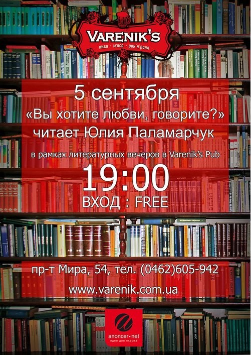 5 сентября, 19.00 – «Вы хотите любви, говорите?». Вечер поэзии Юлии Паламарчук. Вход бесплатный.