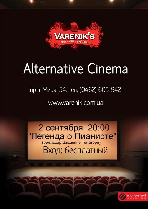 2 сентября, 20.00 – «Легенда о Пианисте» (реж. Джузеппе Торнаторе). Вход бесплатный.