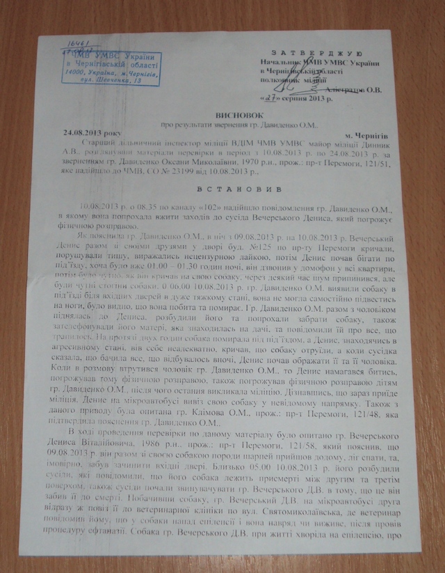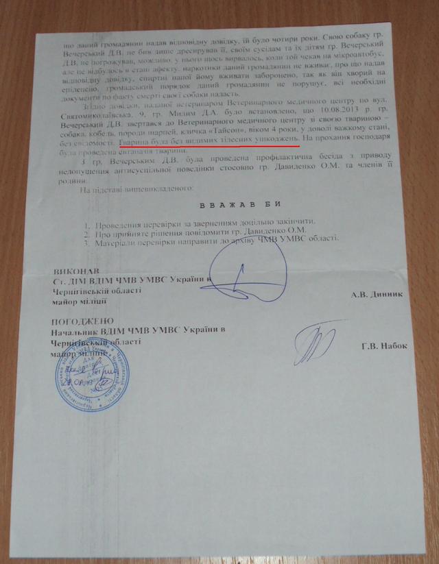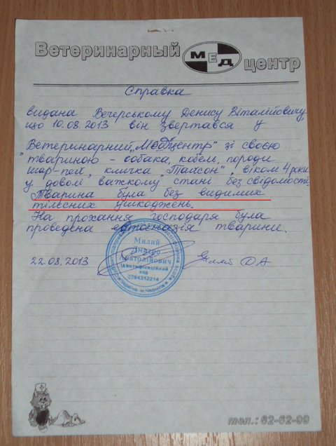 Однако на следующий день, когда журналисты интернет портала gorod.cn.ua проверили данную информацию и уточнили достоверность фактов, которые указал читатель, у правоохранительных органов, оказалось, что причиной такого состояния у животного стало не избиение, а приступы эпилепсии. В статье, которая вышла на следующий день после публикации информации от нашего читателя, мы это указали. Однако родственники Дениса Вечерского, дабы поставить окончательно точку в этой истории, пожелали документально подтвердить факт того, что пес действительно наблюдался у ветеринара с диагнозом «эпилепсия». Поэтому они связались с нашей редакцией, и предоставили документы, опровергающие комментарий читателя Данила Маленко.