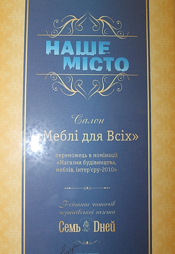 Признание черниговцев подтверждает ряд почетных наград: салон «Меблі для всіх» дважды побеждал в конкурсе «Наше місто», неоднократно становился участником и номинантом специализированных выставок, имеет сертификаты партнерства и звание лучшего дилера многих отечественных мебельных фабрик.