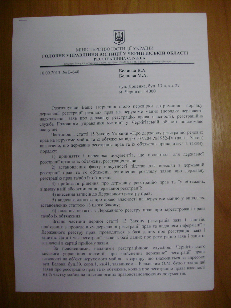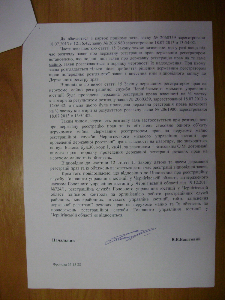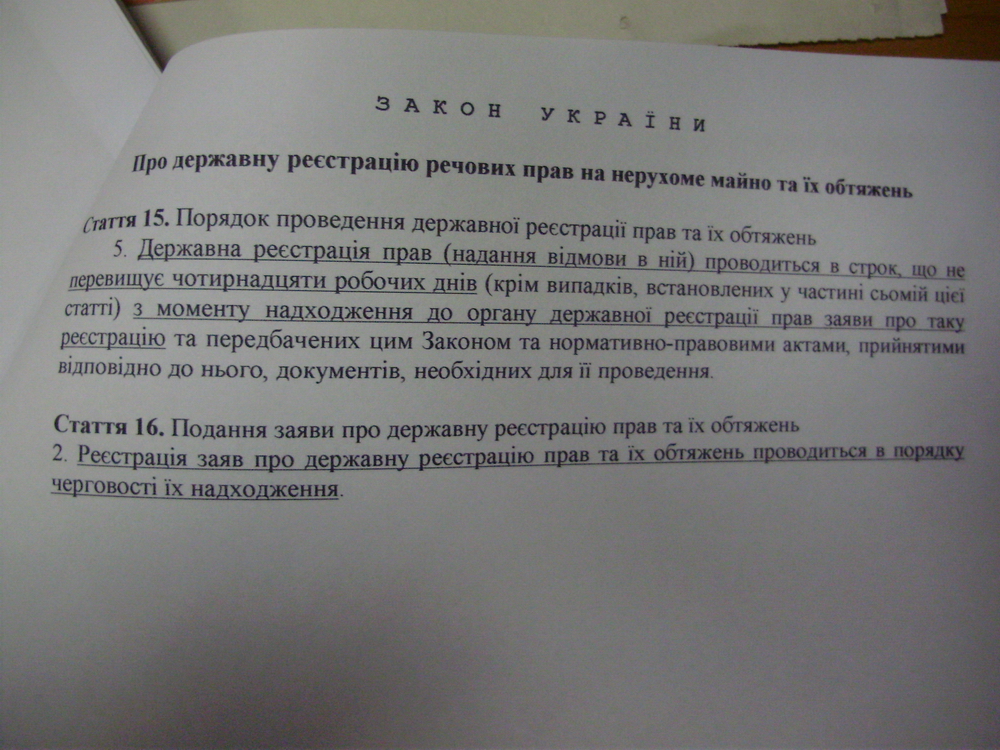 Коли потерпілі зверталися із заявою до керівництва Реєстраційної служби, чи була порушена черговість документів під час реєстрації цих двох витягів, відписка надійшла цілком у дусі держслужбовців: "дотримані вимоги". Те, що потерпілі запитували про порядок черговості всіх документів, що надходять до реєстратора, а не цих двох по спірній квартирі, у реєстратора скромно "не помітили".