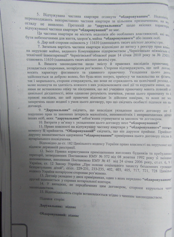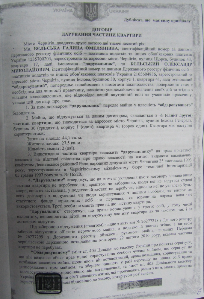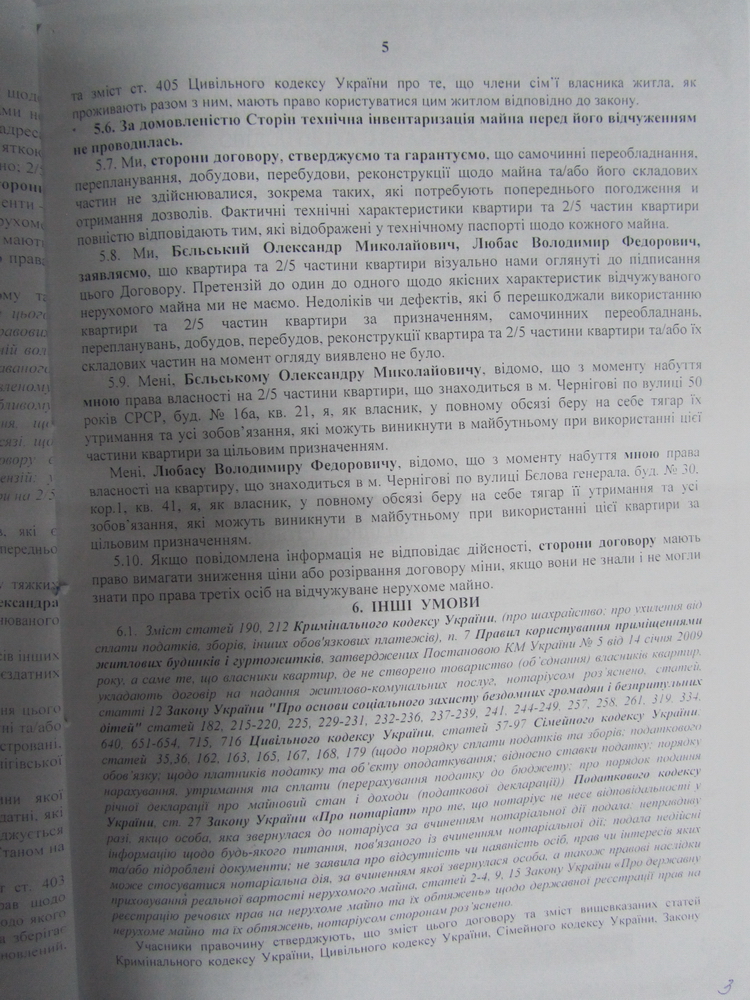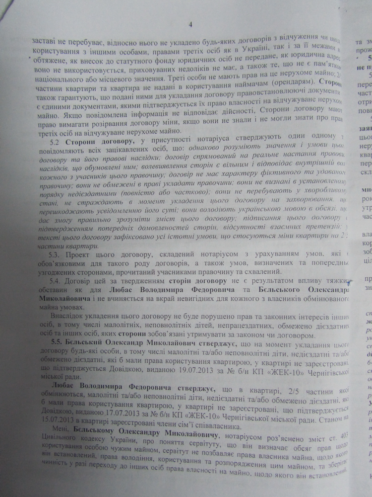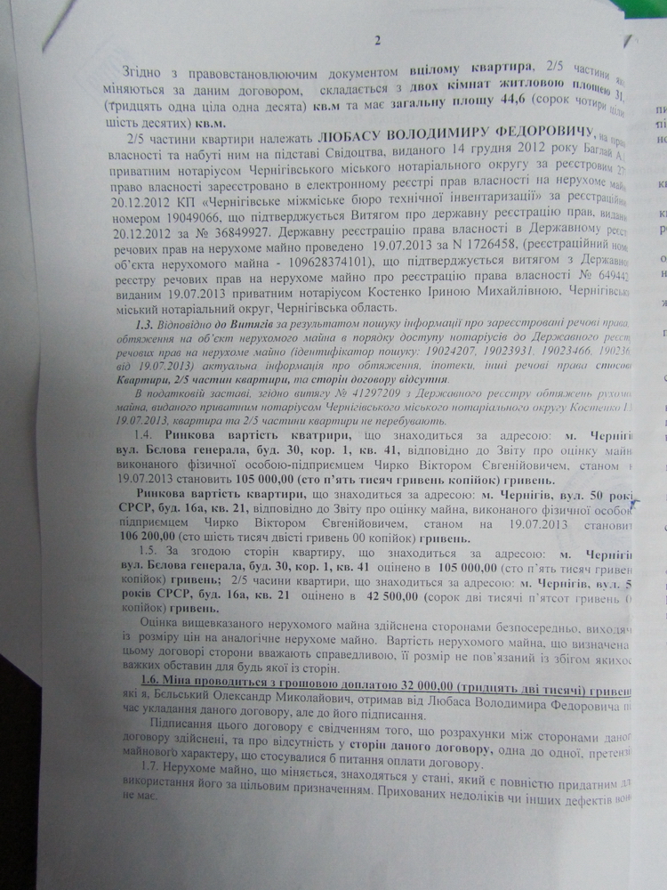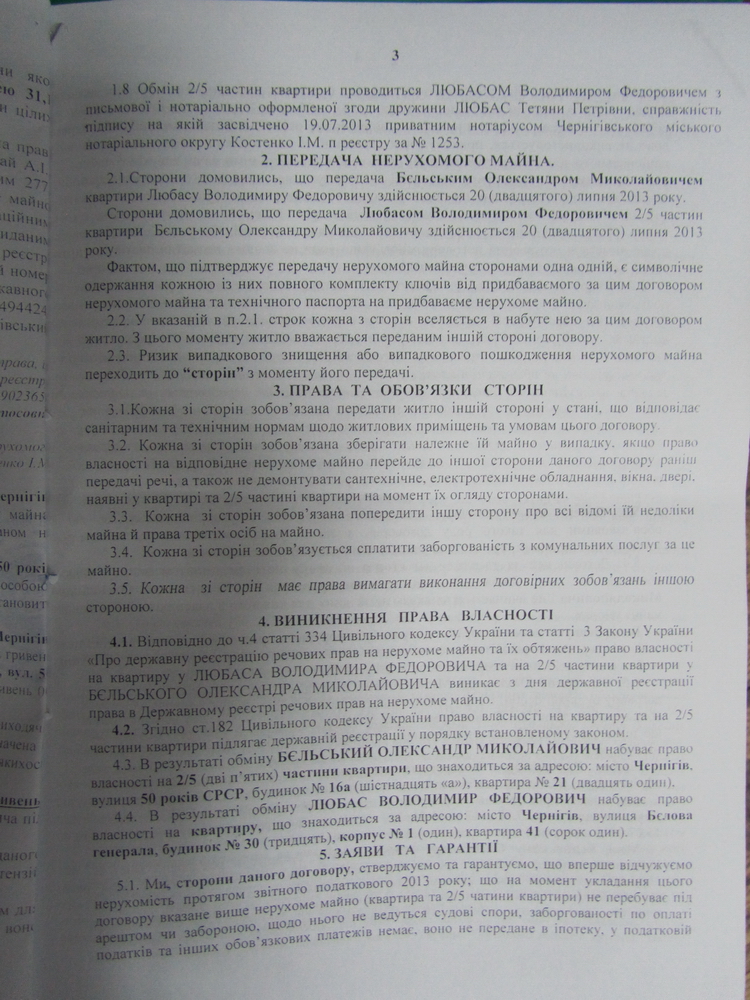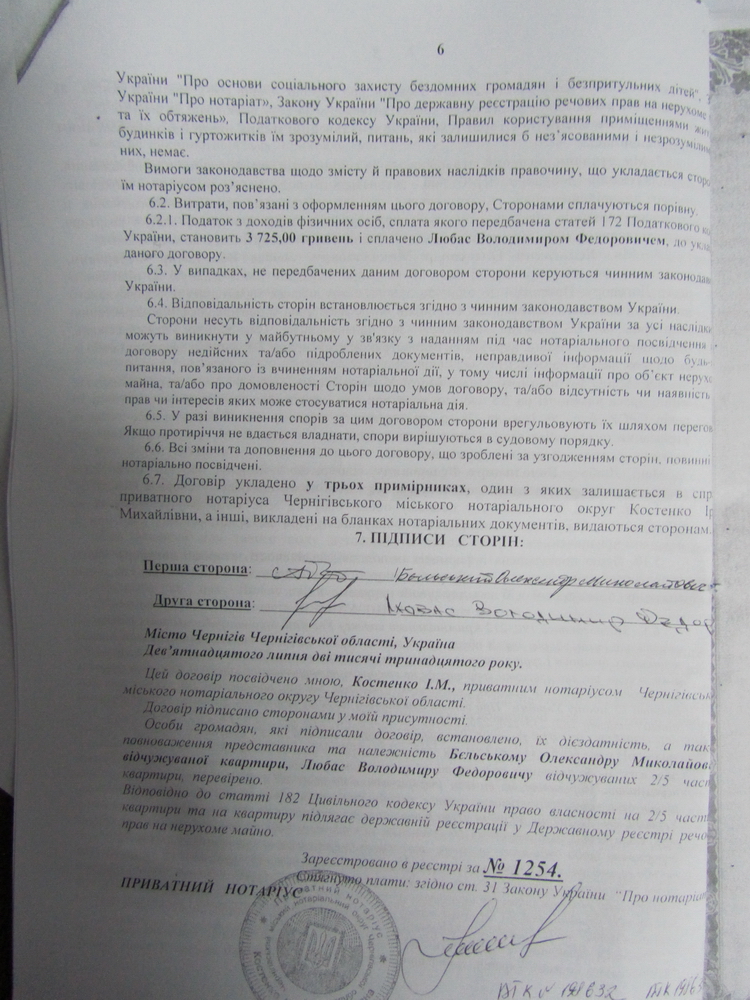 В той час як у договорі сестер Беляєвих вона вказана у розмірі майже 182,5 тисячі грн. А ось на час укладання другої угоди по вже проданій квартирі, договору обміну між О.Бєльським та В. Любасом вартість квартири різко зменшується. Підселили туди десяток китайців, різко впали стіни і протекли всі крани, чи просто необхідно було зменшити вартість для того, щоб уникнути податків? Адже ринкова вартість двокімнатної у договорі міни вказана сміхотворна - 105 тисяч грн. Куди поділося ще майже 80 тисяч грн. вартості житла - невідомо, але чи у повному розмірі отримала держава податки і чи законним було таке зменшення ціни - хотілося б спитати у компетентних органів.