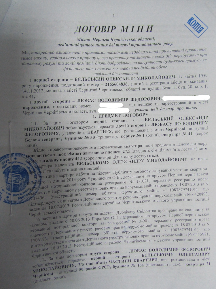 Договір міни між Бєльським Олександрамо та Любасом Володимиром