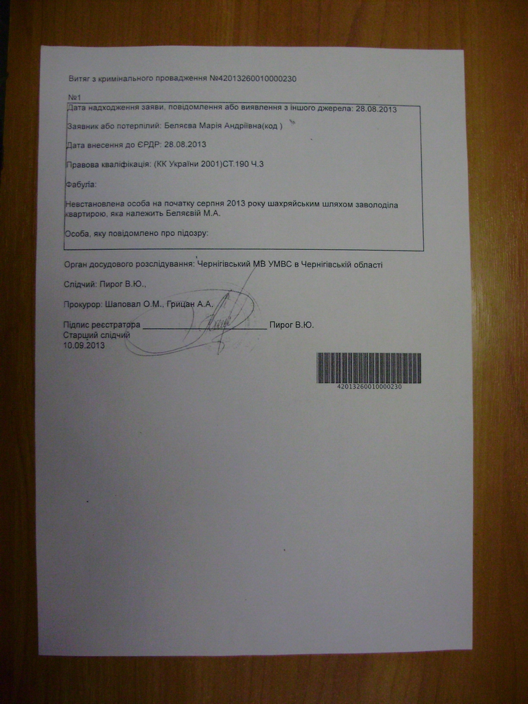 Що ж стосується допомоги міліції ошуканим громадянкам, то ситуація на цей час така: у даній справі, що відкрита за ст. 190 ч.3 "Шахрайство" фігурує "Невстановлена особа". І сестри вже не мають надії на те, що слідчий Пирог В.Ю. стане шукати людей, всі прізвища та адреси яких вказано в справі.