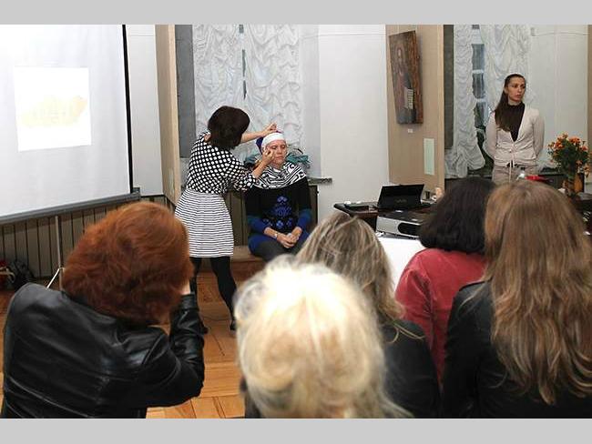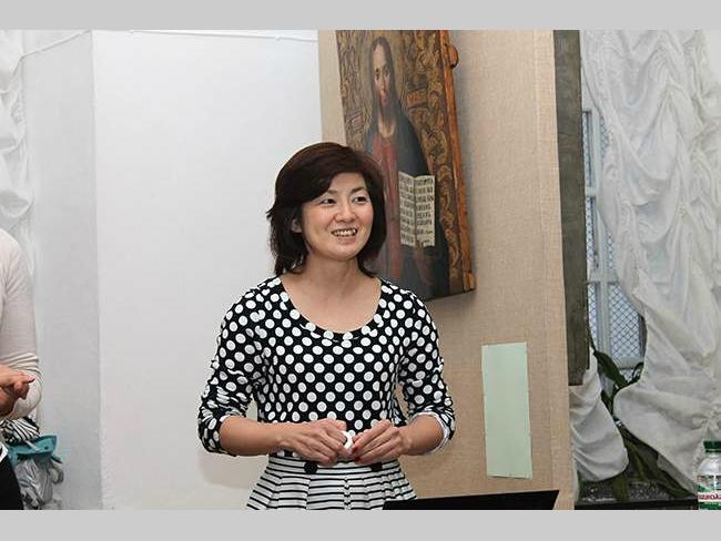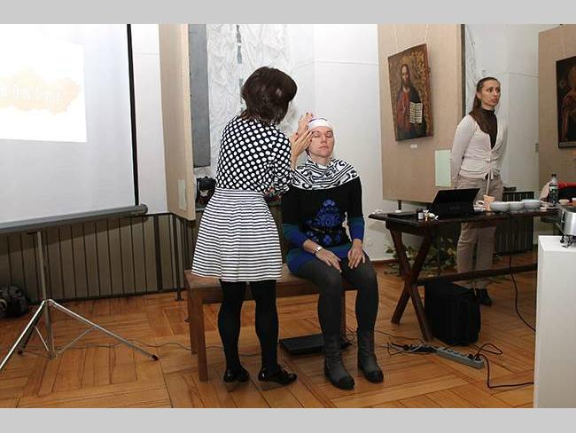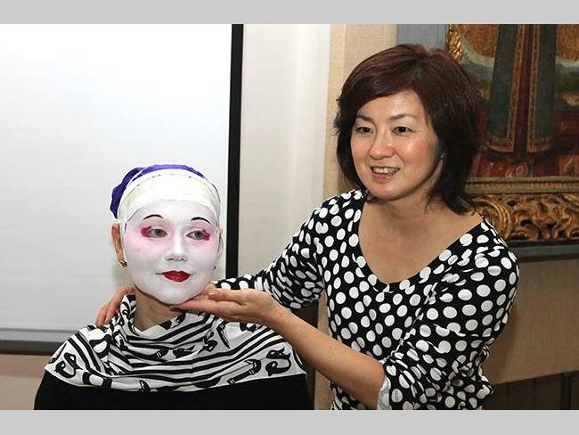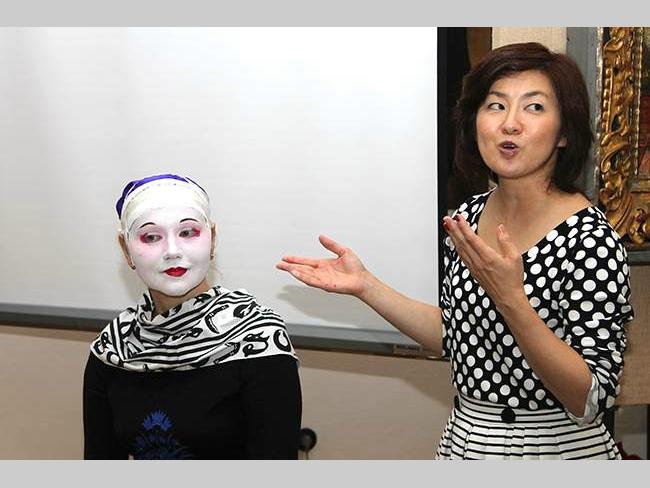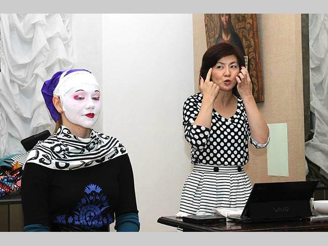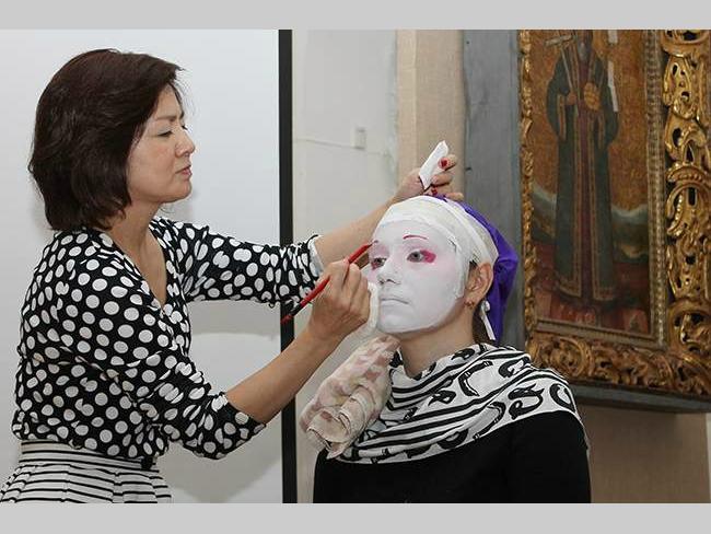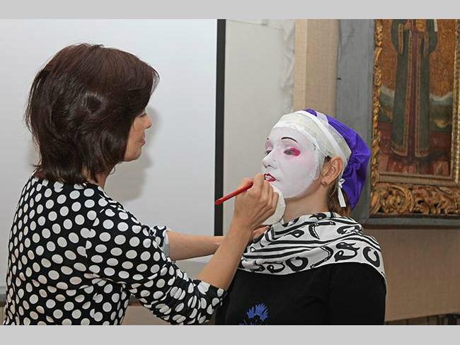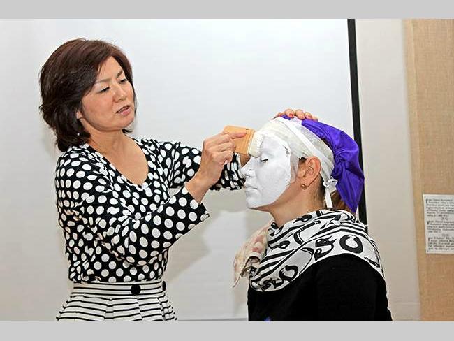 Миловидная японка Миясиро Эмико — эксперт традиционных искусств Японии, через переводчицу рассказала и продемонстрировала все тонкости макияжа, поэтапно проделав его на лице модели.