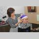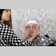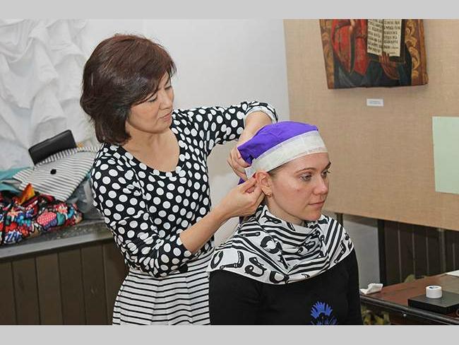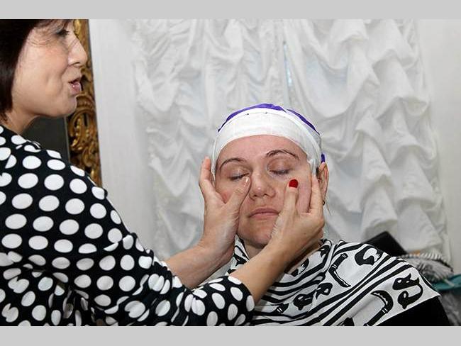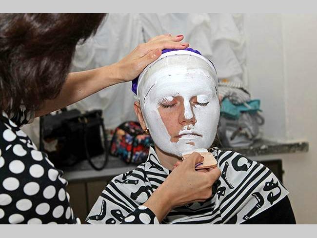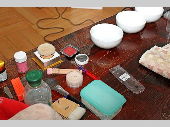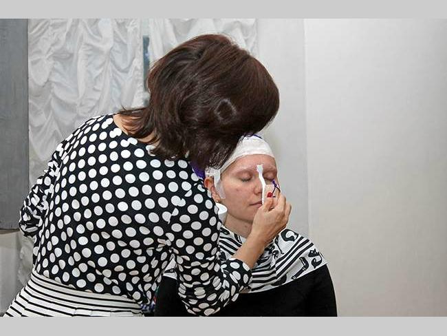 Прежде всего, г-жа Миясиро накрыла волосы модели специальной повязкой, обезопасив их от попадания краски. А затем принялась растирать в ладонях специальное масло, которое используется для подготовки лица перед наложением краски. Этот подготовительный процесс по ее словам — очень важен. Требуется наносить масло на лицо очень тщательно и внимательно. Брови модели она также покрыла специальным кремом на основе воска.