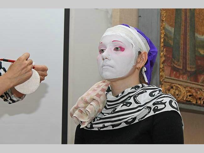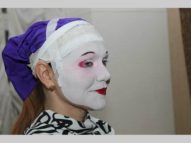 Подготовив таким образом лицо, она развела белую краску. Раньше такие белила делались на основе свинца и иногда приводили к отравлению. Современную краску делают по другим технологиям и она сегодня — совершенно безвредна.