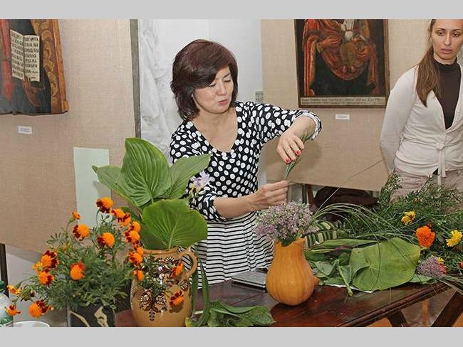После макияжа Миясиро Эмико продемонстрировала японское традиционное искусство икебаны. Она объяснила основные принципы создания композиций из живых цветов и продемонстрировала несколько традиционных видов икебаны. Также г-жа Миясиро показала и рассказала, как можно создавать красивые композиции у себя дома, не тратя при этом больших средств на приобретение цветов, а просто использовав растения из своего собственного сада.