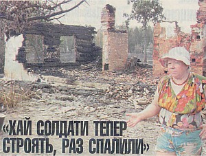 — Загорівся воєнний ліс за нами, — розказує Анатолій Анісовець, працівник Косачівського лісництва. — Остерський лісгосп тушить отказався, сказали — не наш ліс. Наші теж не тушили — команди не було. А в мене дві хати згоріло — наша і тещина. Губернатор каже: шукайте хати по селу, купимо. А що воно за хати — ні дверей, ні погреба. Я в лісництві 16 років проробив. Невже не можуть хату построїть, бідні такі? У мене все приватизоване, я гроші оддав за землю. Хто в мене тепер її купить?