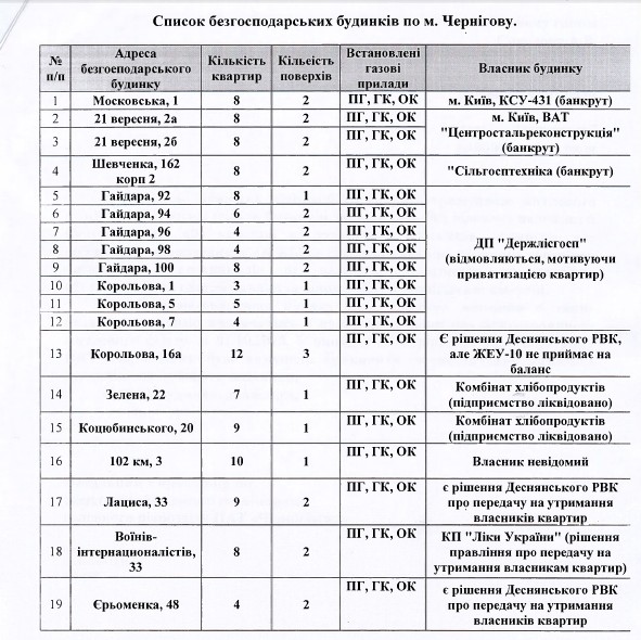 Угроза отключения газа нависла над 19-ю многоквартирными домами нашего города. В результате ликвидации предприятий-балансодержателей жилого фонда многие дома остались без ведомственной принадлежности и системы газоснабжения в них не обслуживаются. ПАО «Черниговгаз» угрожает отключением, если в домах не появятся новые собственники – объединения совладельцев многоквартирных домов.