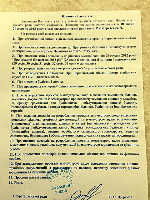 21 октября мы переговорили с депутатами, проработавшими день в комиссиях по подготовке 34-й сессии горсовета. Вопрос о сносе комплекса по Любечской,26 для депутатов оказался сложным, и однозначного мнения по нему нет. Похоже, что его будут рекомендовать на рассмотрение сессии горсовета. Кроме того, как сказал один из депутатов, 18 сентября 2013 года прокуратура города сообщила, что 10 сентября Черниговскому городскому голове внесено представление для устранения фактов неподобающего исполнения служебных обязанностей должностными лицами городского совета и данные об уголовном правонарушении 4 сентября 2013 года внесены в Единый реестр досудебных расследований. Досудебное расследование проводит городской отдел УМВД Украины в Черниговской области.