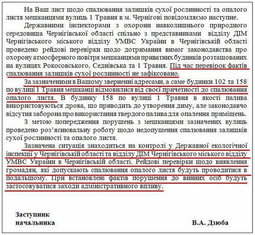 Далее Дзюба В.А. указывает, что: «За зазначеними в Вашому зверненні адресами, а саме будинки 102 та 158 по вулиці 1 Травня мешканці відмовилися від своєї причетності до спалювання опалого листя». То есть ни зафиксированный на фото факт правонарушения ни показания журналистов, написавших заявление, не стали доказательством правонарушения и поводом для того чтобы оштрафовать нарушителей экологического законодательства. И если заместитель начальника экологической инспекции как-то аргументирует уход от ответственности владельца дома 158 по ул. 1-го Мая, то причину, по которой штраф не выписали владельцу дома 102 по ул. 1-го мая, Дзюба В.А. вообще не объясняет.