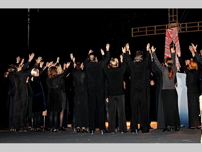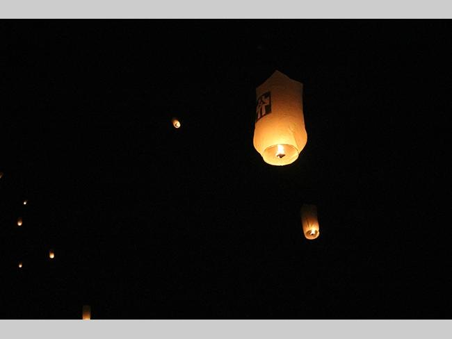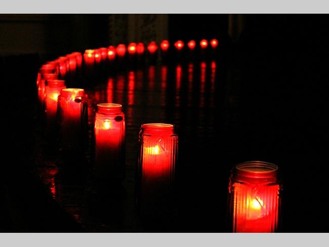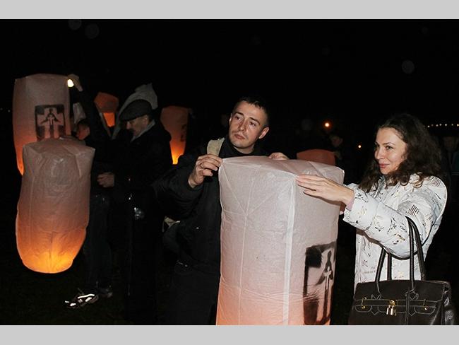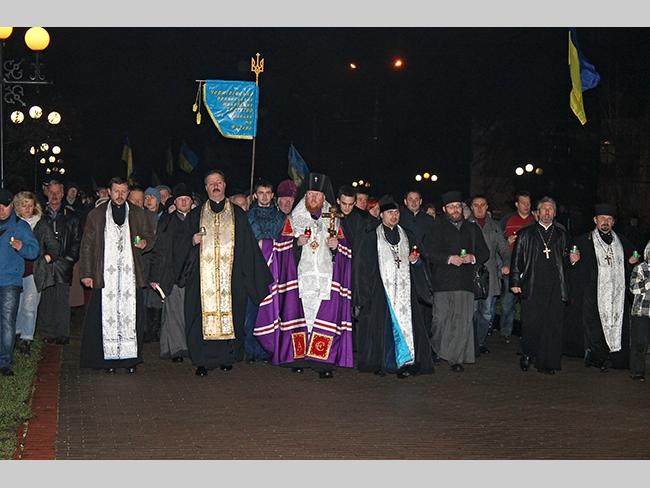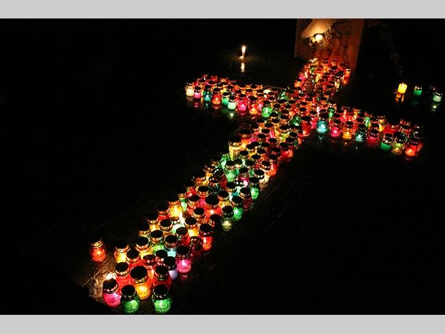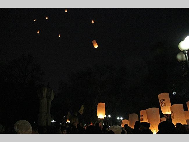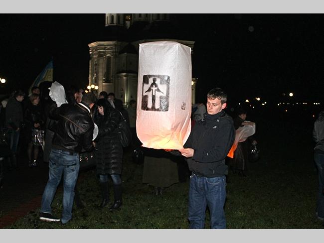 Участники процессии выложили из лампадок большой крест у памятника борцам за свободу и независимость Украины и запустили в небо 80 фонариков с символическим знаком памяти жертв голодоморов.