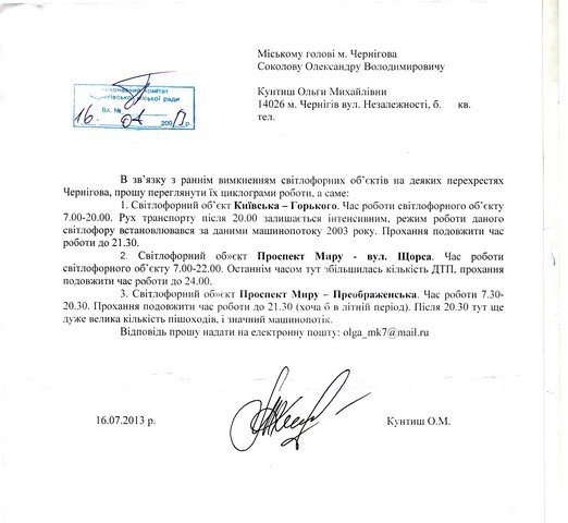 После выхода первого материала, светофоры на Боевой стали работать до 23.00, вместо 21.30. Как оказалось, из-за человеческого фактора в обслуживающем предприятии неверно была запрограммирована циклограмма. Чтоб решить проблему по остальным перекресткам, начальник Управления транспорта и связи Черниговского городского совета Владимир Воронин посоветовал написать письменное обращение в горсовет. Это, по его словам, позволит вынести и рассмотреть вопрос работы светофорных объектов на постоянно-действующую комиссию по безопасности дорожного движения. Мы решили проверить на практике, как реагирует городская власть на заявления черниговцев.