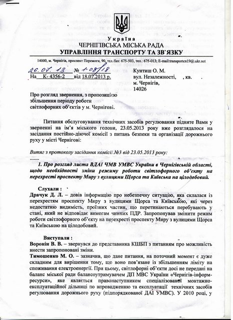 До комиссии наше обращение так и не дошло: спустя 10 дней пришел ответ с управления транспорта о том, что данный вопрос рассматривался еще в мае 2013. Ответ был более похож на отписку. Комиссия действительно поднимала этот вопрос весною этого года, но только по одному перекрестку Проспект-Мира - Щорса. По двум остальным светофорным объектам управление транспорта видимо решило умолчать. Соответственно ответ был предоставлен не в полном объеме:
