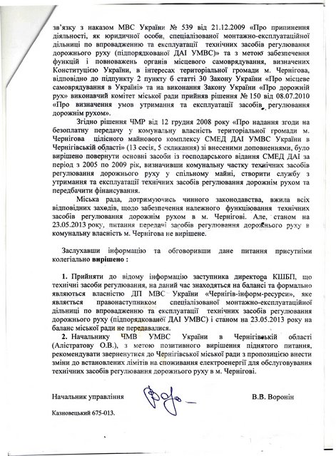 В ЖКХ города утверждают, что они работают над передачей светофоров вплотную. Здесь пообещали разобраться с лимитами на электроэнергию и рациональностью раннего выключения светофоров. Заместитель начальника производственно-технического отдела Плейко Наталия 22 ноября 2013 г. сообщила нашему сайту, что вопрос со светофорами пока не выносился на комиссию, так как комиссия с периода нашего обращения еще не заседала. По словам Наталии Викторовны, управление ЖКХ дважды направляло письменный запрос в управление транспорта и связи черниговского городского совета относительно нашего обращения. По ее словам, к документу прилагалась информация из ГАИ, относительно количества аварий на перекрестках. По непонятным причинам такой запрос писали дважды: первое письмо по ее утверждению не дошло, повторное было отправлено 15.10.2013 г. Результата нет и по сегодняшний день.